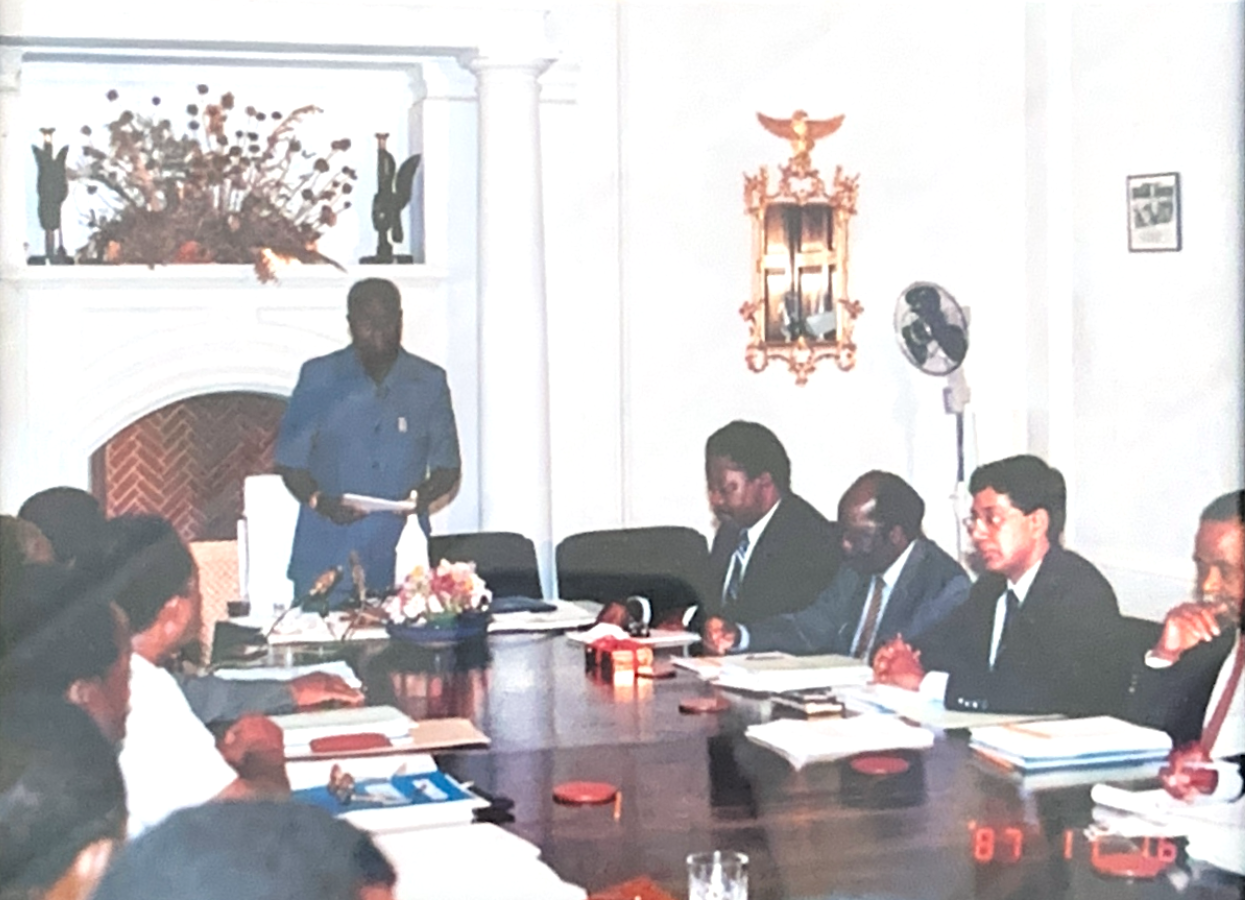 Mohamed Muhsin, Financial Director of ZIMCO attending the Board meeting in 1987 chaired by Dr. Kenneth Kaunda President of Zambia; along with James Mapoma Director General Zimco; also in picture Prime Minister Kebby Musokotwane, Axon Soko, Mohamed Muhsin, Francis Kaunda,Chairman of ZCCM